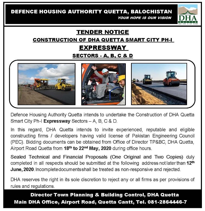 Quetta: DHA Quetta is now processing the bids submitted by contracting firms that are interested in completing the construction of “DHA Expressway” project.